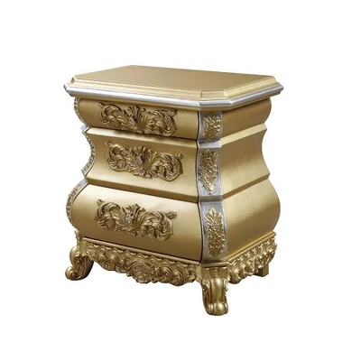 Intricately hollow carved design with romantic scrolling accent highlights this extraordinary style. The Seville Bedroom Collection creates opulence and drama in your room with the dazzling gold hue that enhances its detailed extravagance. Button tufted headboard and footboard add depth and a luxurious sense of comfort. Matching casegoods offer self-closing drawers with built-in safety stops and felt-lining. Show your confidence and make a bold statement in your personal space with the Seville Bedroom Collection.