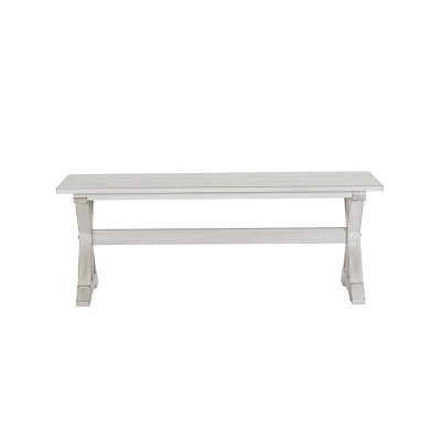 The Boraam Jamestown Dining Bench is dripping with quaint farmhouse charm. This plank-style bench and its trestle base are constructed from a combination of solid wood and medium density fiberboard. Everything is then coated in a white wash finish, which adds a charming vintage effect. Easy assembly is required – tools and hardware come included. Be sure to pair this bench with the matching Jamestown Dining Table and Dining Chairs from Boraam.