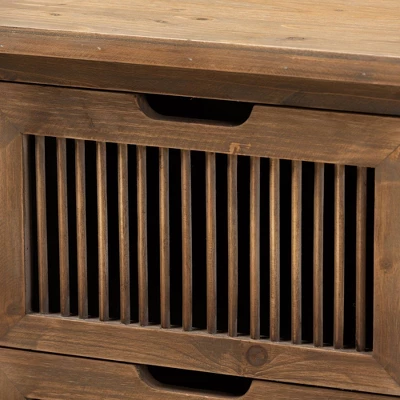 Rustic tones and clean lines make the Clement end table a handsome addition to any space. This sturdy wood end table displays a medium oak finish that highlights the wood grains for a cozy, rustic look. Two drawers provide ample space to store a variety of household essentials. Spindle detailing lends visual interest, while cut-out drawer handles enhance the natural appeal of the end table. The Clement end table is made in China and will arrive fully assembled. Dimensions: 24.02″ high x 18.9″ wide x 13.39″ deep; Drawer dimensions: 6.1″ high x 15.75″ wide x 11.81″ deep; Legs: 3.15″ high;
