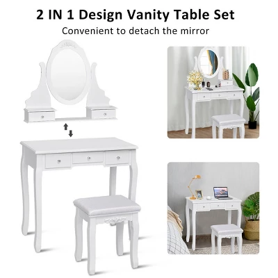 Enjoy some much needed personal grooming space with our new vanity and stool set. The table with a round mirror and 5 drawers is of great value. Made of wood and MDF, it is stable and can serve you for a long time. 5 drawers is great for storing all your jewelry and smooth tabletop provides space for cosmetics and beauty supplies. Round mirror is clear enough, and you can sit on the comfortable stool and make yourself up. Come and buy one!