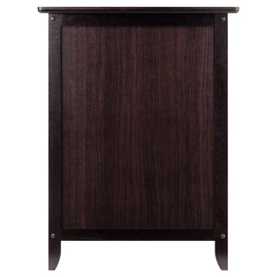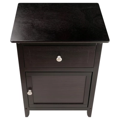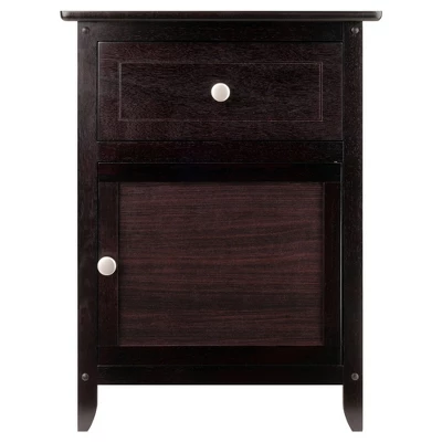 Clear bedside clutter with this Espresso Eugene Nightstand from Winsome. This sturdy wood nightstand features a single drawer and a spacious lower cabinet. The dark wood finish works well alongside sofas, reading chairs and beds, and easily blends in with many decor styles. The large drawer at the top can be used to stow anything from bedtime essentials to handy knick-knacks, while the lower cabinet doubles as a storage space for books, magazines and other daily utility items. Plus, the elegantly beveled top offers good space to display your favorite collectibles.