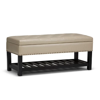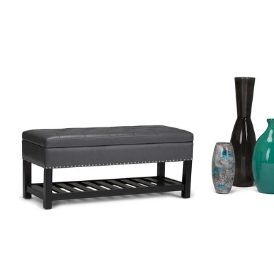 Riley 43 inch Wide Traditional Ottoman Bench. Comes with child safety hinge to prevent lid slamming. Top easily lifts to reveal a storage compartment; Open slat bottom shelf for additional storage. Dove gray Linen Look Polyester. Available in Tanners Brown, Chocolate Brown, Midnight Black, Satin Cream, Crimson Red, Stone gray Faux Leather or Slate gray, Dove gray, Fawn Brown Linen Look Fabric. . Efforts are made to reproduce accurate colors, variations in color may occur due to computer monitor and photography. The product is warranted to be free from defects in material and workmanship to the original owner for the life of the product (conditions apply).