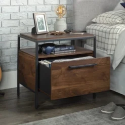 Add some style to your bedroom with this night stand from the Shoal Creek collection. It features one easy-to-access drawer that opens and closes on smooth metal runners, making it perfect for storing your favorite night time read, glasses, and remote. Find even more storage with the lower open shelf. Finished in a modish dark Jamocha Wood, this bedside table will take your room from drab to fab.