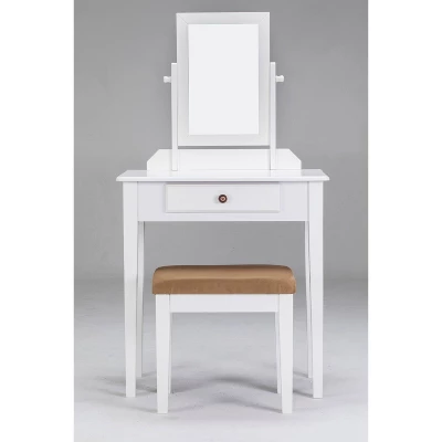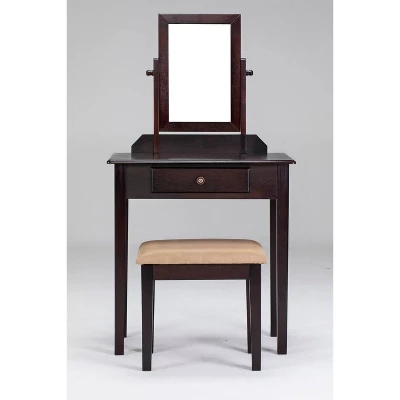 Start your morning routine in sleek style with the Vanity Set from Ore International. This elegant vanity set strikes a streamlined silhouette with a chic espresso finish for a timeless look. The tabletop surface is perfect for displaying makeup brushes, a vase of flowers or other accessories, while the middle drawer provides you with additional storage and organization for all your beauty essentials. A coordinating backless bench features a padded construction to keep you comfortable while perfecting your makeup routine, along with a tilting mirror for added convenience.
