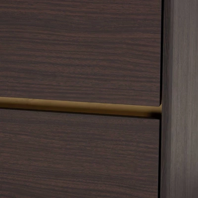 The sleek, modern flair of the Walker nightstand organizes your space in stunning style. Made in Malaysia, the Walker radiates rich wood tones with its dark brown finished frame. Two spacious drawers accommodate your lifestyle with plenty of space for bedside essentials. Requiring assembly, the Walker features a touch of gold, as well as a faux marble top, for luxurious accents steeped in modern glamour. With its radiant design and flexible convenience, the Walker nightstand is a superb addition to any space. Dimensions: 18.9″ High x 18.9″ Wide x 15.75″ Deep; Drawer Dimensions: 3.6″ High x 15.5″ Wide x 10.4″ Deep;
